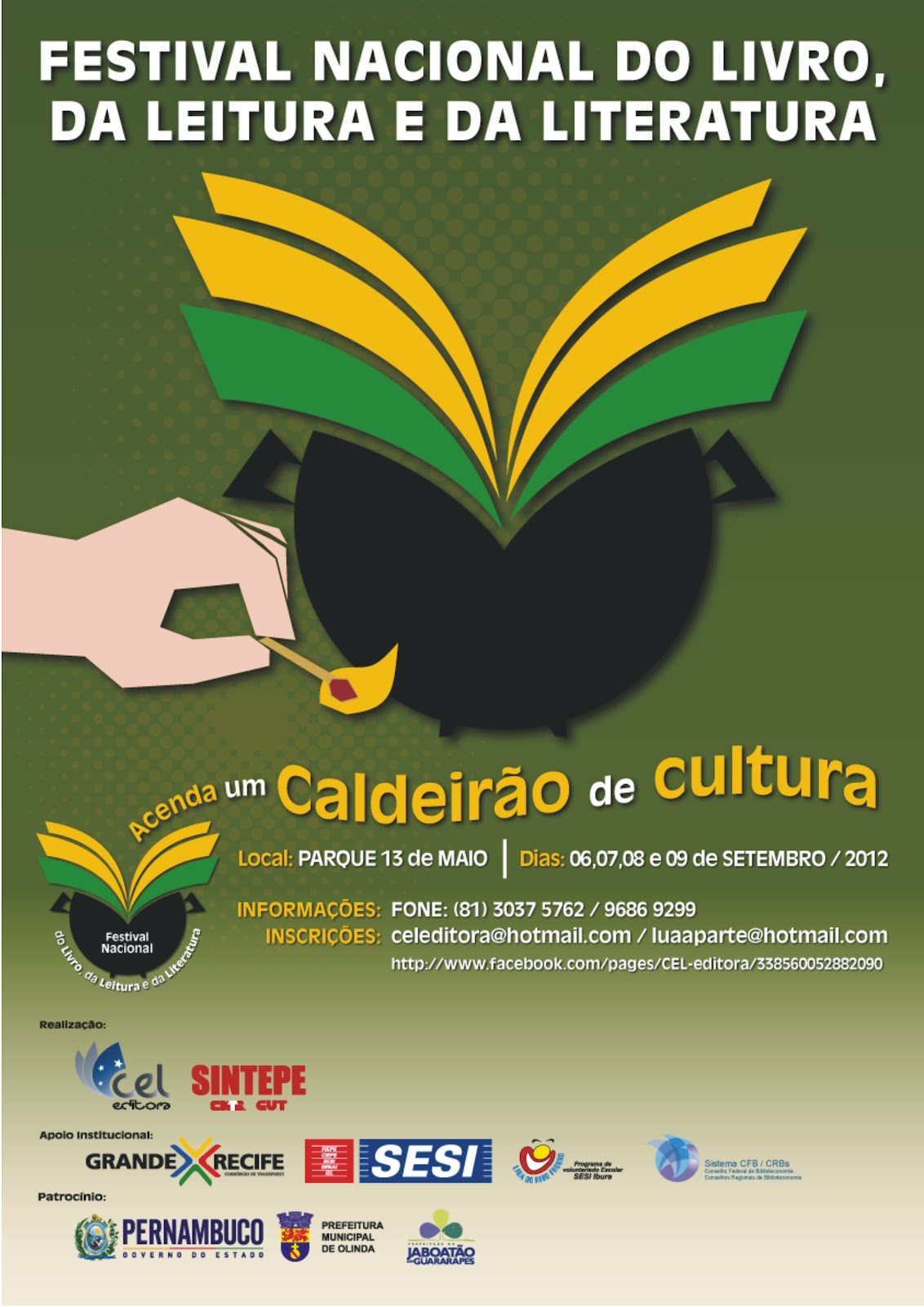 O feriadão da Independência do Brasil, a área central do Recife recebe a primeira edição do Festival Nacional do Livro da Leitura e da Literatura. O evento, realizado pela Casa dos Escritores de Pernambuco (CEP) em parceria com o Sindicato dos Trabalhadores de Educação em Pernambuco (Sintepe), acontece no Parque 13 de Maio entre os dias 6 e 9 de setembro. Workshops, oficinas, shows musicais e o lançamento de onze livros de escritores pernambucanos marcam a diversificada programação que vai ser aberta com um Trajeto Literário – Procissão Poética –saindo da concentração na Praça Oswaldo Cruz, Boa Vista, seguindo pela Avenida Conde da Boa Vista até o Parque 13 de Maio, área central do Recife, onde acontecerá a abertura do evento.